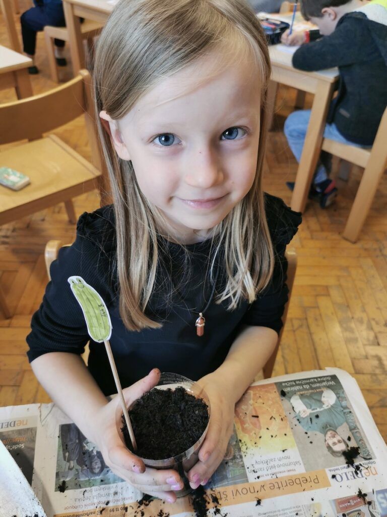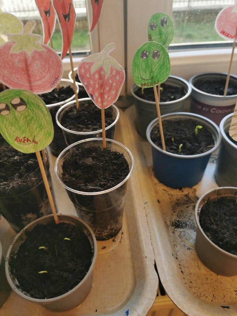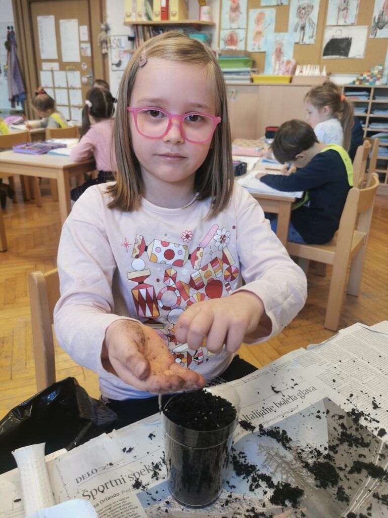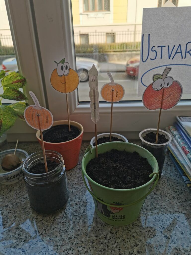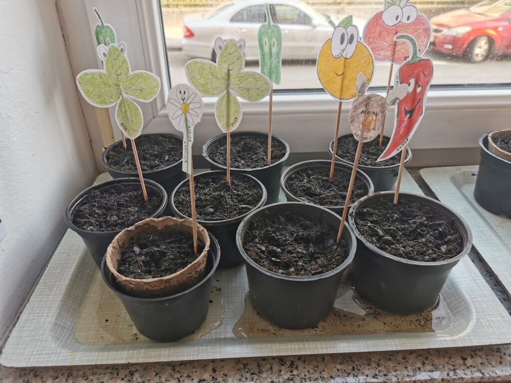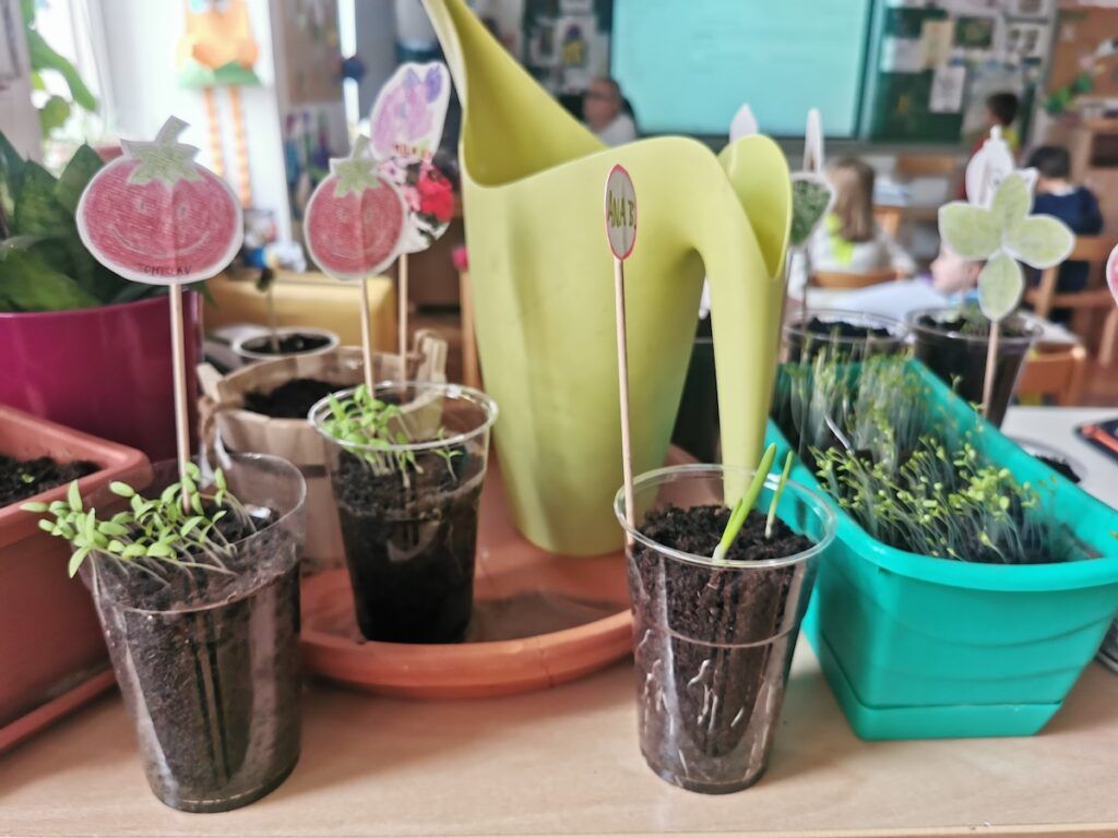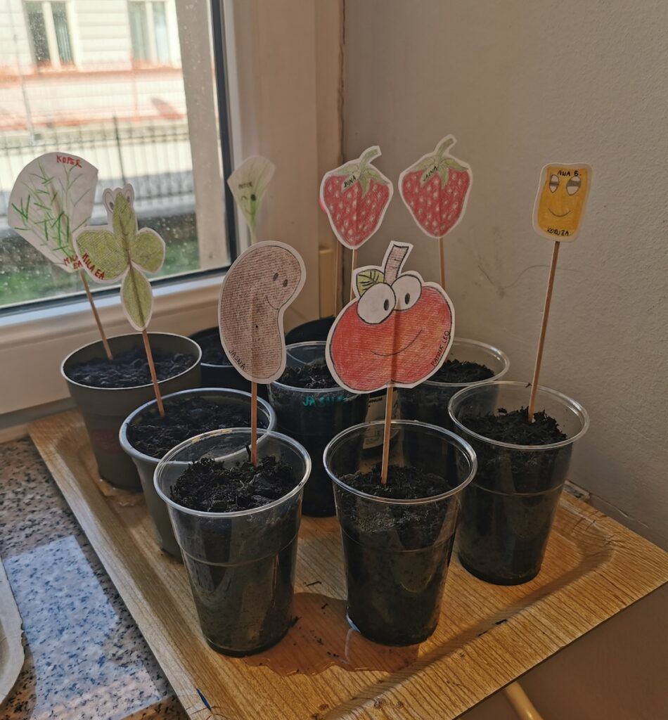 Učilnica se je kaj kmalu napolnila z lončki, v katere smo posejali semena zelenjave in sadja. Vsak lonček smo skrbno označili in poskrbeli, da zemlja nikoli ni bila suha. Naš trud je bil hitro poplačan, saj so nas že kmalu razveselile prve rastlinice.