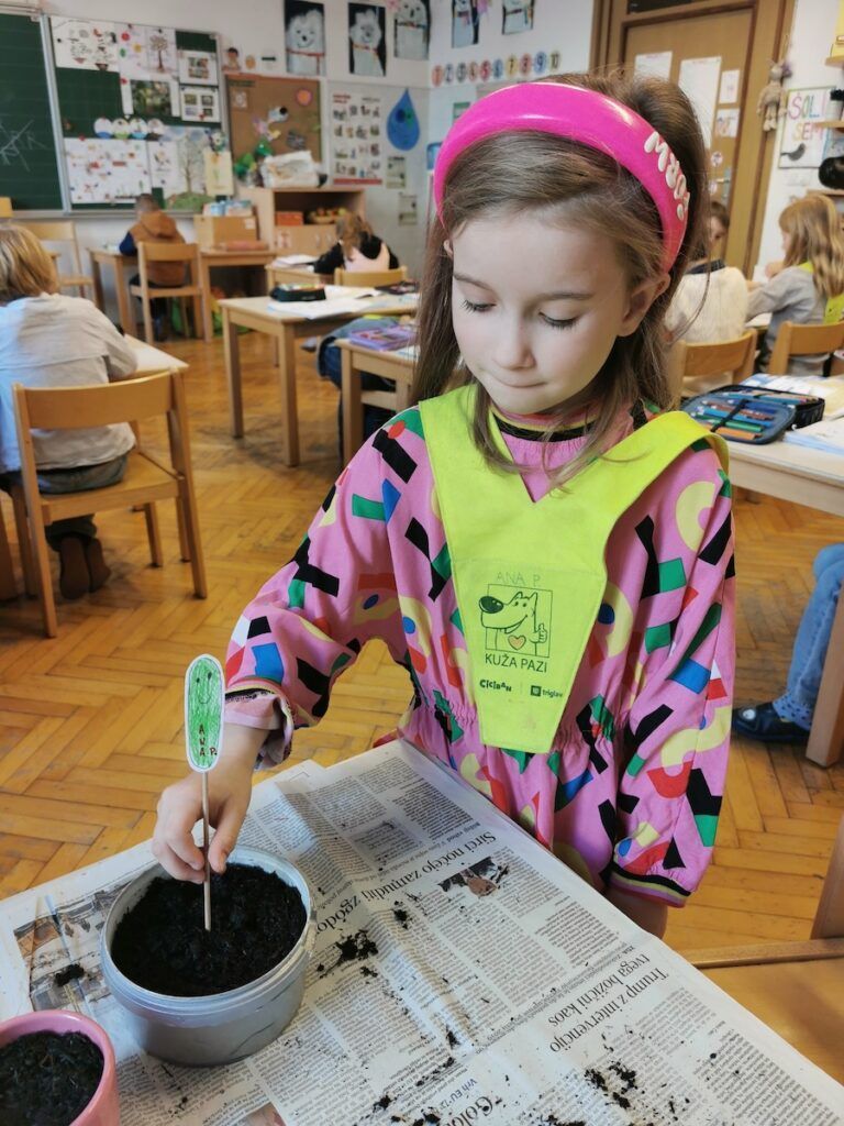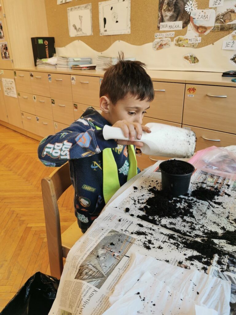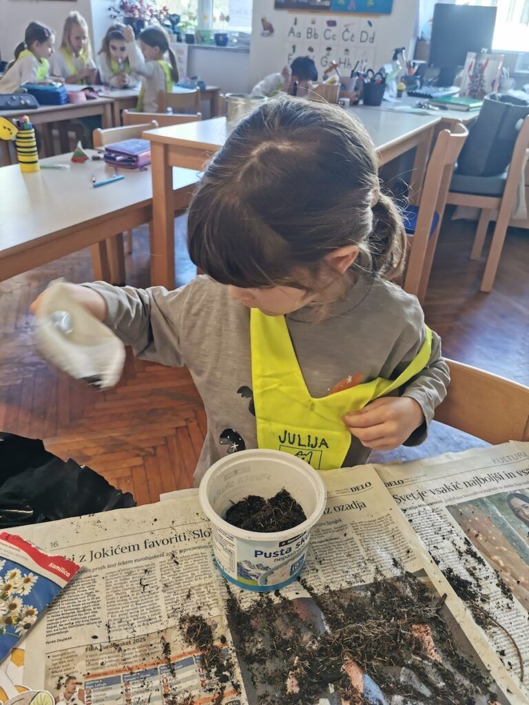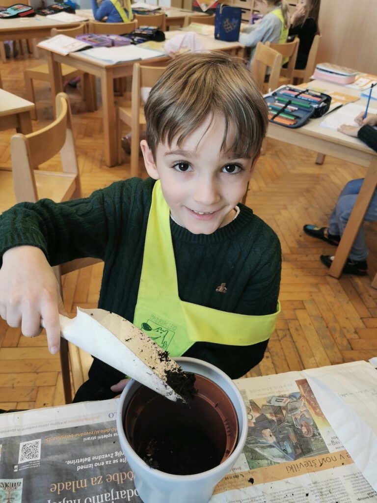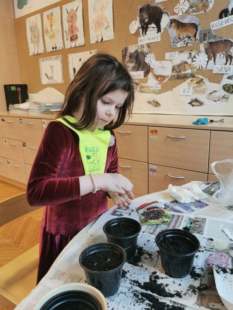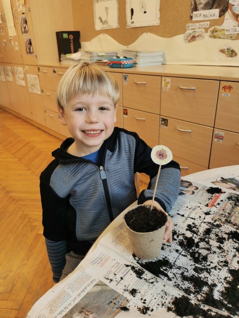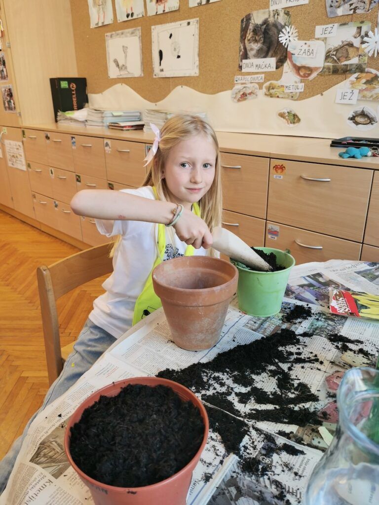Učilnica se je kaj kmalu napolnila z lončki, v katere smo posejali semena zelenjave in sadja. Vsak lonček smo skrbno označili in poskrbeli, da zemlja nikoli ni bila suha. Naš trud je bil hitro poplačan, saj so nas že kmalu razveselile prve rastlinice.