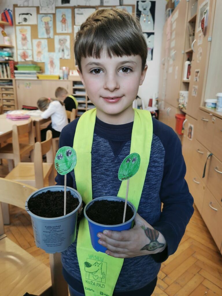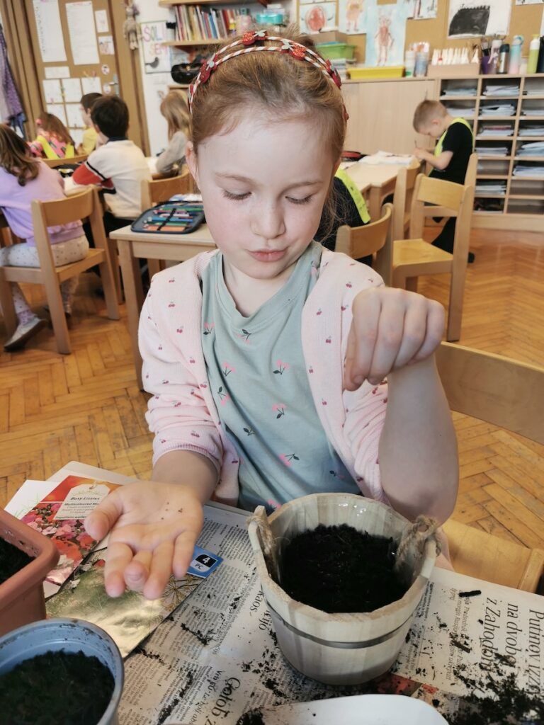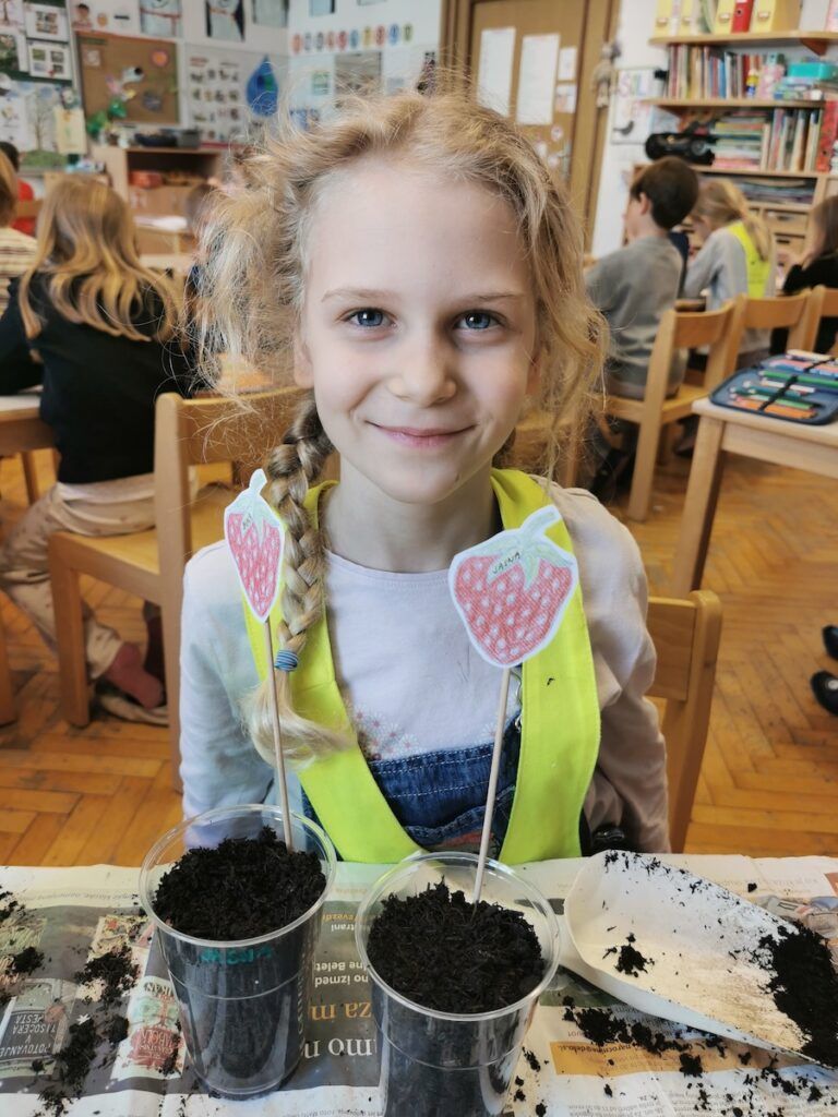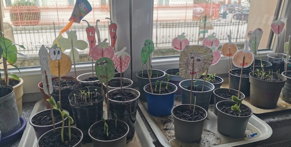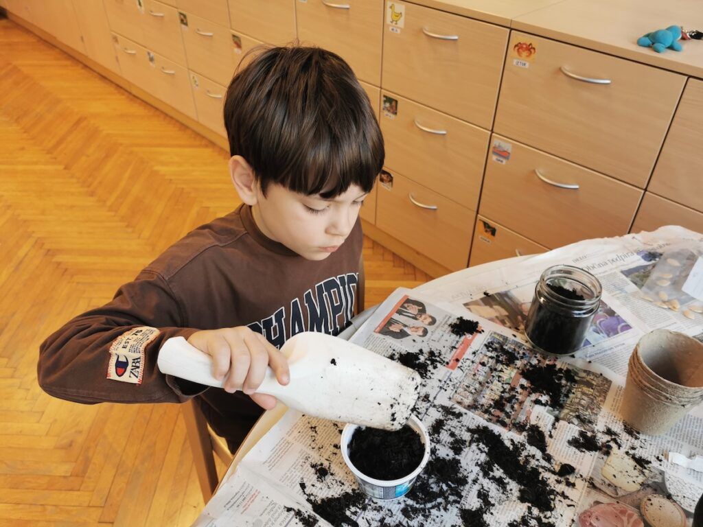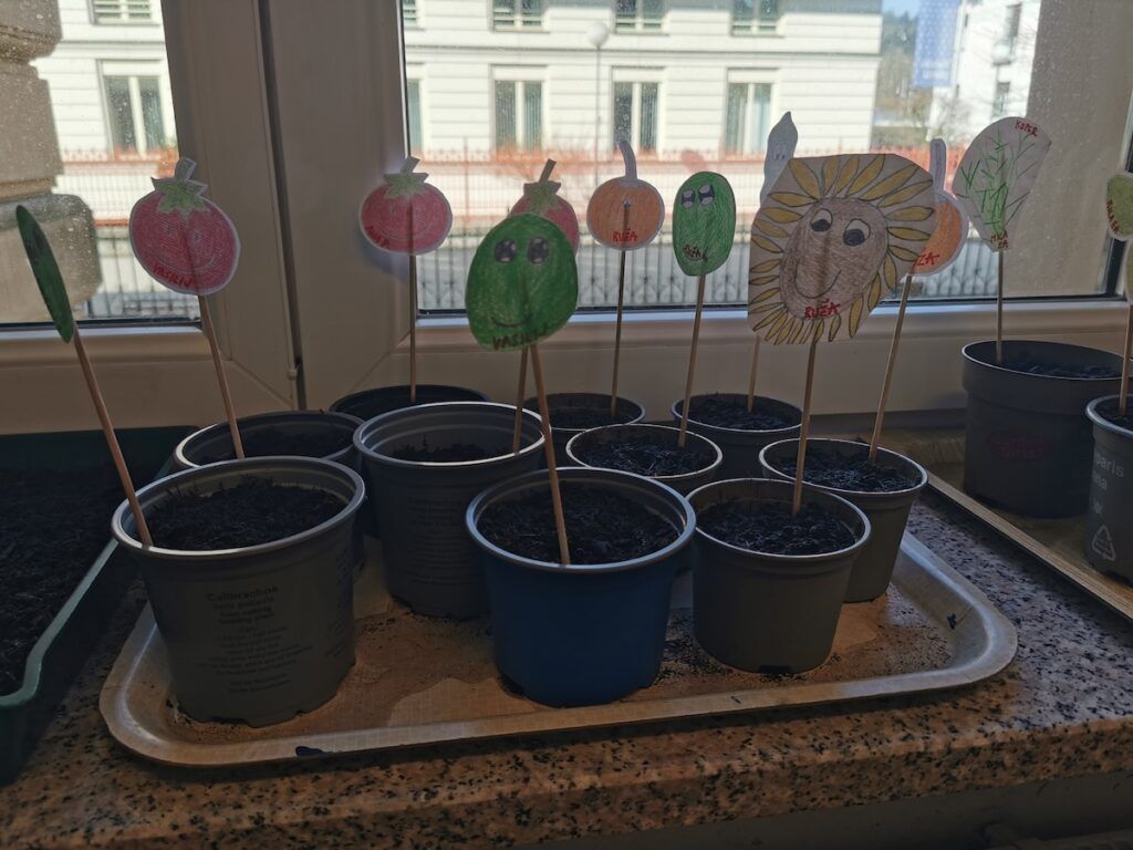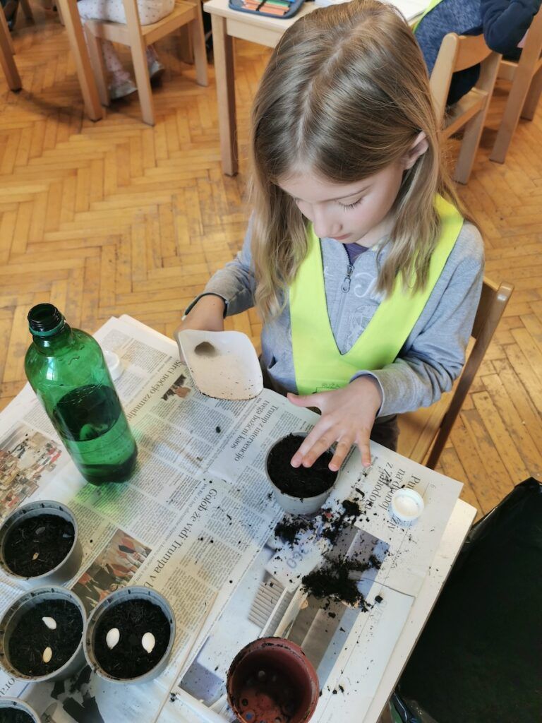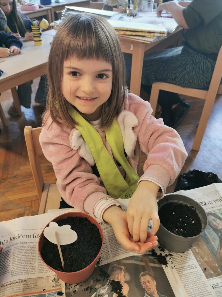 Učilnica se je kaj kmalu napolnila z lončki, v katere smo posejali semena zelenjave in sadja. Vsak lonček smo skrbno označili in poskrbeli, da zemlja nikoli ni bila suha. Naš trud je bil hitro poplačan, saj so nas že kmalu razveselile prve rastlinice.